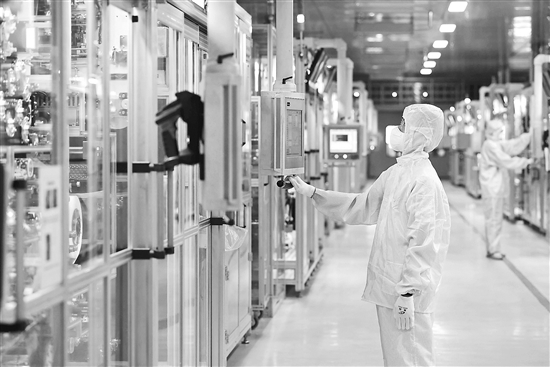 7月17日,在合肥一家动力电池生产企业的生产车间,技术人员在锂电池生产线上作业。