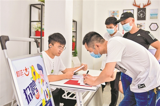 7月19日,在浙江省湖州市长兴县雉城街道,退役军人和退役军人家属正在应聘。