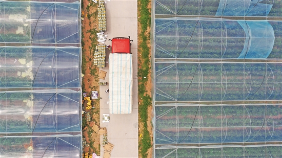 7月19日,在银川市兴庆区月牙湖乡穹顶(宁夏)生态科技有限公司蜜瓜种植基地,卡车将蜜瓜装车准备运往销售地(无人机照片)。
