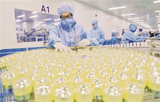 7月20日,浙江省湖州市德清县一家珍珠生产企业的工人在化妆品生产线上忙碌。