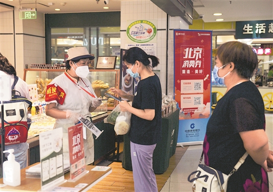 7月20日,北京一商场,顾客在咨询北京消费券使用方法。