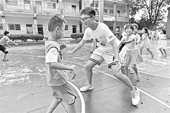 在江西省南昌市湾里管理局罗亭镇义坪小学,大学生志愿者和留守儿童一起做游戏(7月19日摄)。