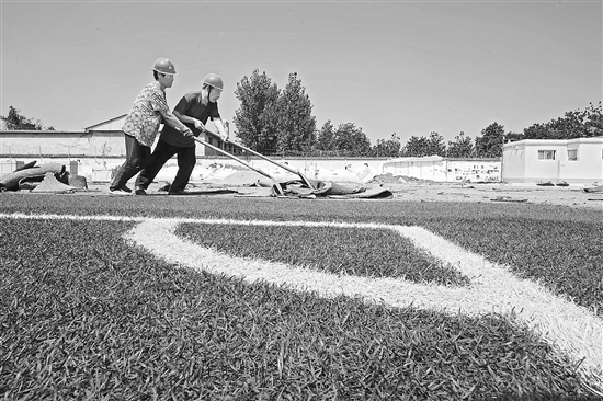 7月20日,工人在河北省临城县鸭鸽营中学清理旧跑道。暑假期间,河北省临城县对部分中小学的操场、地面、校园管网、教室设备等进行改造提升。新华社发(田晓丽 摄)