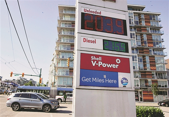 7月20日,加拿大温哥华一处加油站的油价牌显示当天油价。根据加拿大统计局当日公布的最新数据,加拿大2022年6月份的消费者价格指数(CPI)同比增长8.1%。