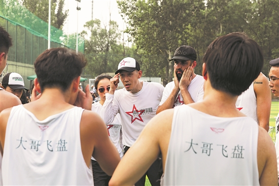 7月16日下午,比赛间隙,飞盘队员在一起商量战术。