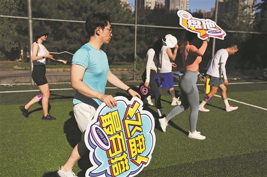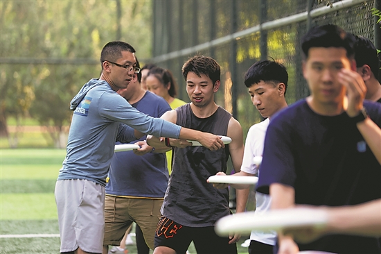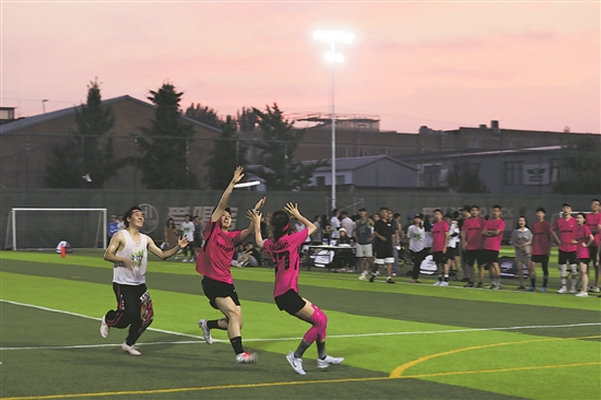 BUC是北京第一个极限飞盘社会组织,2013年由北京首批极限飞盘选手创立。“去年11月我们还只有4个微信群,现在已经20个了,学员近万人。”训练场旁,BUC市场运营负责人杨希感慨道。在她看来,飞盘装备简单、上手快、可以男女混打……尤其是队员在运动过程中需要配合、交流,可以让年轻人在社交上“破冰”,放下手机和社恐,真实自然地融入这项运动。