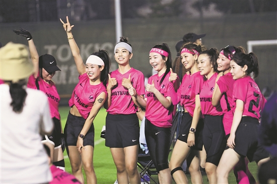 7月16日,一场飞盘比赛结束后,队员们在场边合影。