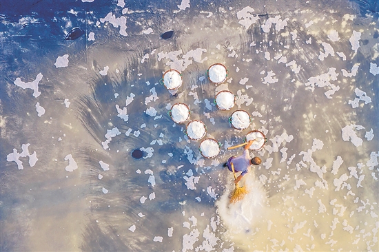7月23日,盐农在浙江省宁波市北仑区白峰街道外峙岛上的盐田收盐。当日是大暑节气,盐农忙着晒盐。海盐晒制是一门古老的技艺,每年6月到8月是晒盐的旺季。新华社发 (张辉 摄)