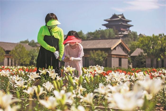 7月24日,北京世园公园首届百合生态文化节上,游客正在欣赏百合花。60个品种、204亩、400万株百合在世园公园次第绽放。
