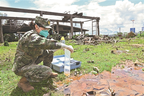 23日,在老挝万象省,中老“和平列车-2022”医疗队解放军疾病预防控制中心人员对模拟灾害现场采集水样,并进行分析作业。
