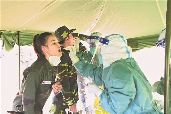 23日,在老挝万象省,中老“和平列车-2022”医疗队解放军疾病预防控制中心人员为参演人员进行核酸采样。