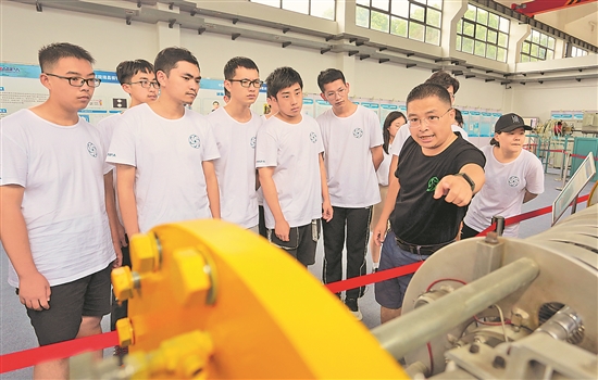 7月26日,江西瑞昌,中国原子能科学研究院研究员在瑞昌核物理应用研究院向夏令营学生们介绍串列加速器。当日,中国原子能科学研究院核物理所优秀大学生夏令营开营,20余名大学生走进中国原子能科学研究院瑞昌核物理应用研究院,近距离与“核”接触。