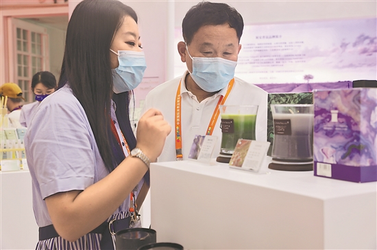 7月26日,在第二届消博会8号馆,参展商正在观看展品。本报记者 赵琛 摄