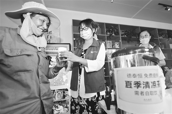 7月19日,在湖州市爱山街道家园志愿广场,志愿者为一名保洁员提供茶饮。为应对连续高温天气,浙江省湖州市在核心商圈设立10余个爱心驿站,供户外工作者和群众避暑纳凉,并在驿站提供多项便民服务,为炎热夏季带来清凉。