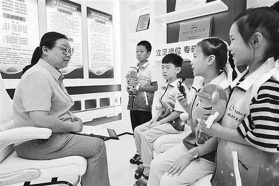 “您为何选择从事建筑行业?”“您能给我们讲讲在工作上的感受吗?”日前,中铁十八局集团五公司驻地小学的学生来到公司企史馆参观,并与全国劳动模范郑卫红零距离交流,切身感受劳模风采。图为郑卫红给孩子们讲述自己的奋斗故事。李学彬 摄
