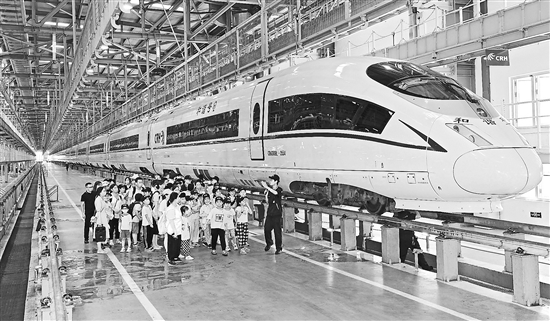7月27日,在合肥南站动车运用所,20多名务工者子女正在聆听机械师关于动车的先进技术和发展历程的讲解。