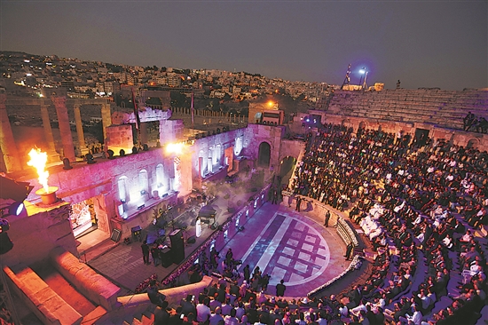 7月27日,在约旦杰拉什,人们在开幕式上观看演出。约旦杰拉什文化艺术节27日举行开幕式。