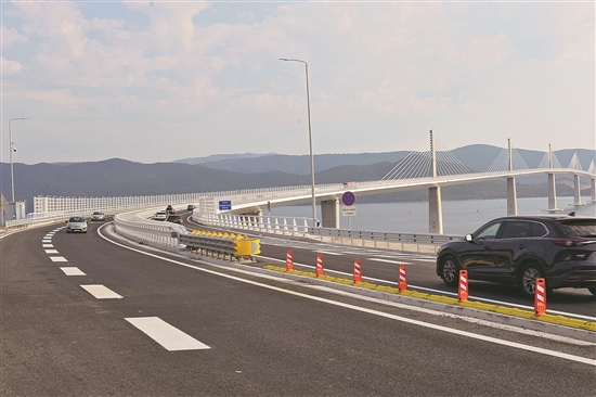 7月27日,在克罗地亚科马尔纳,车辆在佩列沙茨大桥上行驶。7月27日是克罗地亚佩列沙茨大桥正式通车的第一天,运行状况良好。据悉,该大桥项目是中国企业首次中标欧盟基金项目,也是中企承建的由欧盟基金出资的单体最大项目。新华社记者 李学军 摄