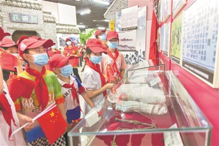 7月29日 ,学生在江苏南通如皋市中国工农红军第十四军纪念馆参观前辈们的历史遗物。当日,学生来到纪念馆开展暑期红色研学课堂活动,接受爱国主义教育,迎接“八一”建军节。