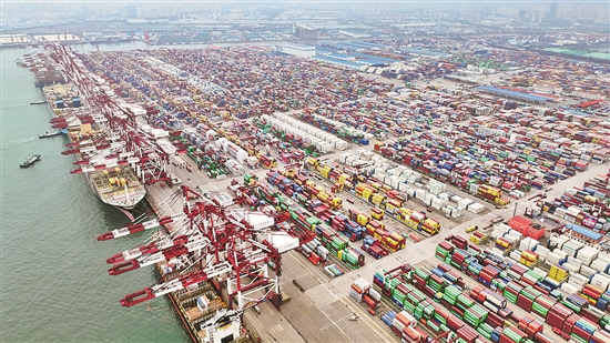 图为繁忙的山东港口青岛港前湾集装箱码头。新华社记者 李紫恒 摄