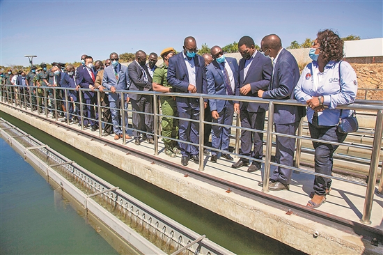 7月29日,赞比亚总统希奇莱马(右三)在卢萨卡省卡富埃参观卡富埃河供水项目。