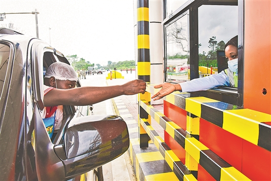 7月29日,在喀麦隆克里比,一名司机在克里比-罗拉贝高速公路收费站付款。
