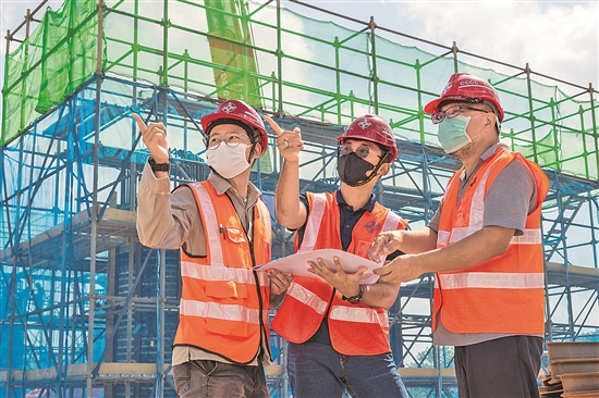 7月25日,西亚赫明(中)在位于马来西亚彭亨州的马东铁项目六分部施工现场工作。 新华社记者 朱炜 摄