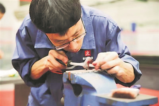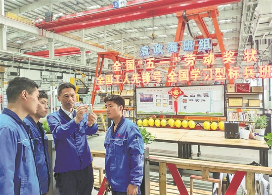 全国劳模袁政海在江铃汽车集团模具厂袁政海班组与组员交流钳工技术,进行技术攻关。