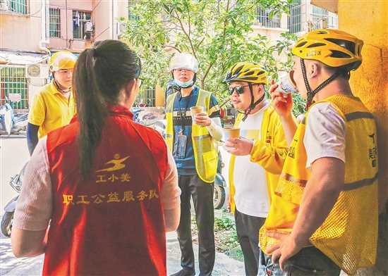 上图为职工公益服务队为外卖骑手送清凉。近日,江西省新余市总工会以“移动的清凉”为主题,通过建设户外劳动者驿站、组织职工志愿者为户外劳动者送西瓜、凉粉等防暑降温物品的方式,做到户外劳动者岗位在哪里,“清凉”就送到哪里。本报通讯员 刘志勇 摄