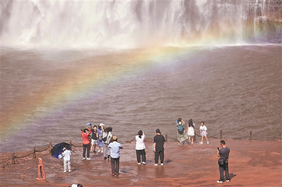 8月3日,游客在赤水丹霞旅游区大瀑布游玩。