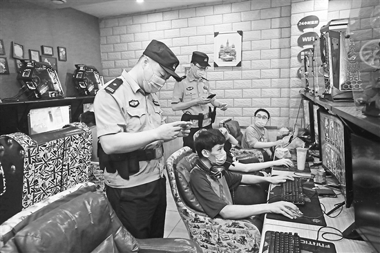 7月30日,济南市公安局市中区分局七贤派出所民警对网吧进行治安清查。自全国公安机关夏季治安打击整治“百日行动”开展以来,公安机关严厉排查和打击社会面各类违法犯罪活动,集中排查治安隐患,解决治安复杂地区的薄弱环节和突出问题,提高群众的安全感与满意度。人民视觉 供图