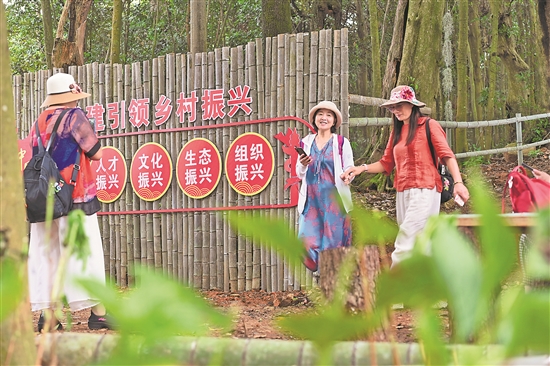 图为8月3日游客在闽侯县洋里乡茶苑村云山蝶谷数字农业示范园的林下灵芝种植示范基地参观游玩。