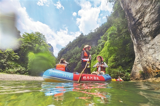 夏日时节,位于贵州省施秉县的杉木河景区迎来大量喜爱漂流的游客,在欣赏优美风光的同时,尽享夏日清凉。新华社记者 刘续 摄