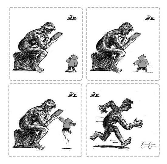 《思想者》是一件伟大的作品,手机是一项伟大的发明。当思想者对手机产生依赖乃至极端依赖,有思想的人看来应该进行一次反思了。看看我们当下的生活,人与工具的亲密关系手机,已经为生活注入了大量荒诞色调。手机施予使用者的便利无需赘言,手机对人们生活的诸多嘲讽也没必要列举了。常言道,漫画就是画思想,面对思想者的精神生活,我们不说不快。