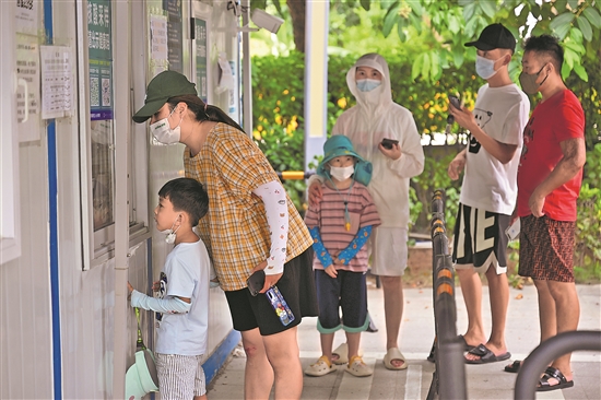 8月7日,游客在三亚一处核酸采样点进行核酸采样。