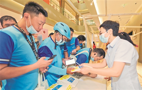 8月8日,江苏省扬州市工会暖“新”行动——“8+X”综合服务集市开张,以“送清凉、送安全、送法律”为主题的全市工会夏季安康“三送”活动同步启动。服务集市向新就业形态劳动者提供体检、专项保险、入会、暖“新”礼包、困难帮扶、能力提升、法律服务、心理咨询等“8+X”综合服务。本报通讯员 张丙涛 摄