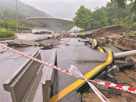 这是8月9日在韩国首尔大学拍摄的因遭遇强降雨而受损的道路(手机拍摄)。新华社记者 王益亮 摄