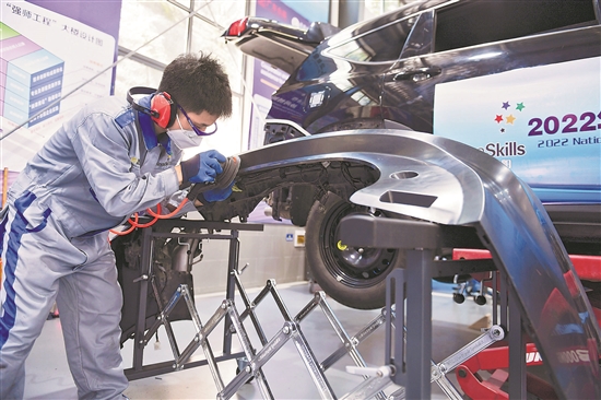 8月9日,2022年全国职业院校技能大赛(中职组)车身修理赛项开赛,参赛选手在进行实操。