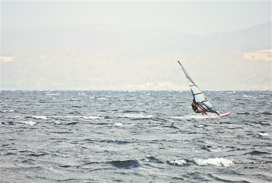 8月7日,游客在意大利布拉恰诺湖冲浪。每年八月是意大利的“国民假期”,人们在此期间享有长短不等的放假时光。新华社记者 金马梦妮 摄