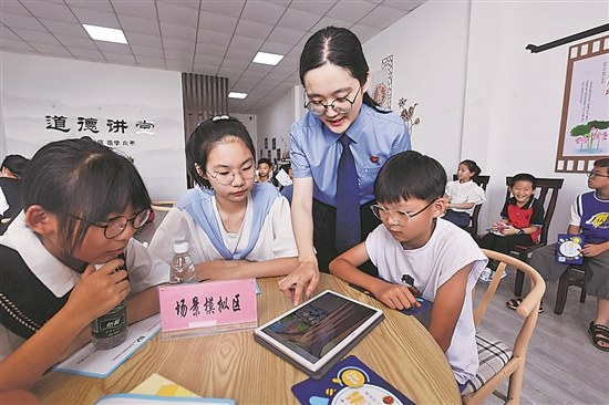 8月11日,湖州市南浔区检察院第三检察部副主任周思娟通过场景模拟游戏的形式,为黄泥兜村的孩子们普及未成年人保护知识。