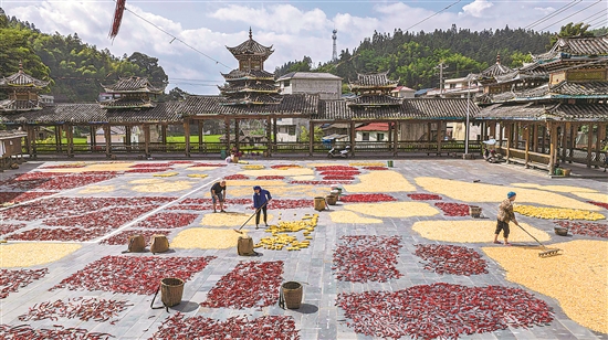 立秋过后,贵州高原乡村处处晒秋忙。玉米、辣椒、稻谷、黄豆等农作物晾晒在农家房前屋后,与周围别具特色的田园风光融为一体,绘就出一幅幅美丽的丰收图景。