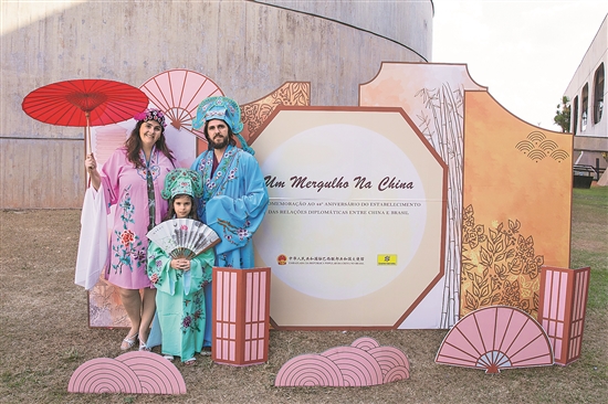 8月13日,在巴西首都巴西利亚举办的“中国一瞬”文化体验周活动上,人们体验京剧服饰。新华社记者 王天聪 摄