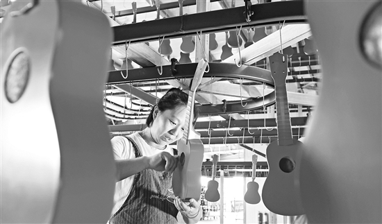 8月13日,在沭阳县桑墟镇一个乐器厂生产车间里,工人正在仔细检查吉他喷漆情况。江苏省宿迁市沭阳县拥有丰富的木材资源,近年来,该县引导木材加工企业由粗放型生产转向精加工,生产的吉他以及尤克里里等精致乐器远销美国、法国、英国、日本等国家,不但提升了木材的附加值和市场竞争力,还直接带动当地群众增收致富。
