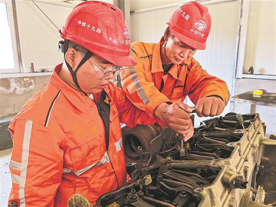 近日,中铁十九局集团矿业公司新入职的235名新职工陆续抵达施工一线。公司把技术革新与传帮带工作作为新职工融入企业的重头戏,由经验丰富的老师傅、岗位能手与新职工签订师徒帮带合同。图为有着30年设备维修经验的大苏计钼矿项目修理厂厂长李放在指导徒弟攻克矿用自卸车发动机维修难题。本报记者 刘静 通讯员 冯宏超 霍常亮 摄