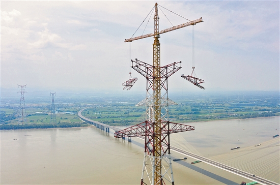 白鹤滩至浙江特高压直流输电工程安徽段长江跨越塔组立完成