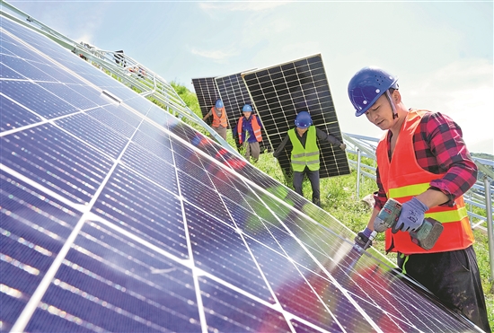 8月17日,在河北省秦皇岛市青龙满族自治县草碾乡华山村附近的荒山上,工人在150兆瓦光伏发电站建设工地施工。
