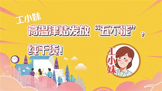 发放高温津贴有“五个不能”,你了解吗?第一,高温津贴不能想不发就不发;第二,不能以免费降温饮料替代高温津贴;第三,不能因缩减工时扣除高温津贴;第四,不能不给非正式员工发高温津贴;第五,不能在最低工资里包含高温津贴。相关的法律法规有哪些?一起来看。(本报记者 贺少成 李逸萌 雷宇翔 史宏宇 )