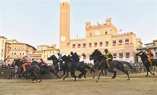 8月17日,骑手在意大利锡耶纳参加传统赛马节。锡耶纳赛马节是世界闻名的意大利传统民间活动,始于1656年,每年7月2日和8月16日举行两次。此前锡耶纳赛马节已连续两年因新冠疫情取消举办。