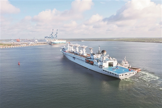 中国远望5号船16日停靠斯里兰卡南部汉班托塔港,进行物资补给。中国驻斯大使戚振宏和斯政府官员、中资机构代表等在码头迎接。