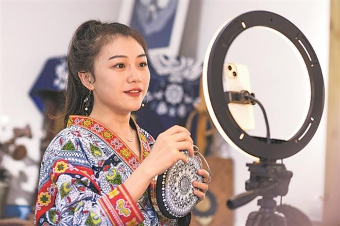 张娟娟直播介绍自己设计的蜡染文创产品。